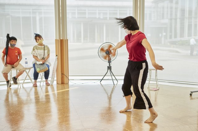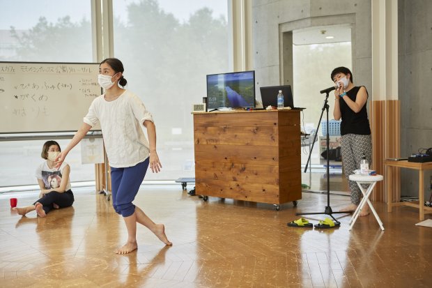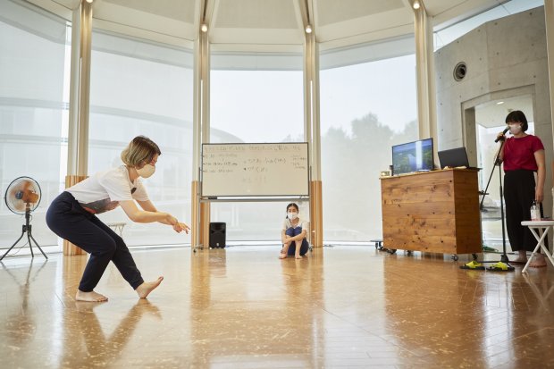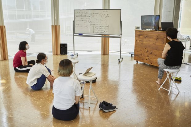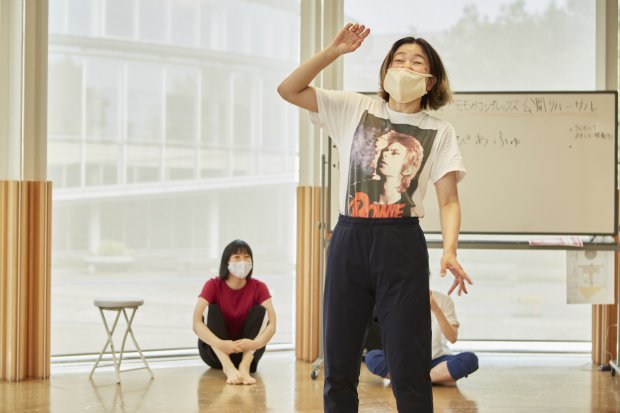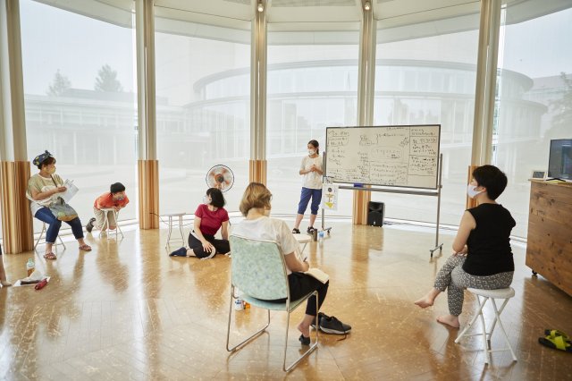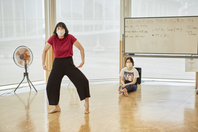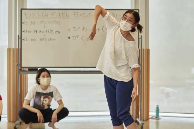 今シーズン1回目のダンスカフェは、7月11~12日に行った『モガ渓谷~記憶はだいたい蜃気楼(穴あき谷のおまつり編)』のライブ配信でお贈りした『穴あき谷の○○。』を、小学校の教室等で上演するための作品へつくりかえる公開リハーサルを実施しました。当初は、映像で配信した作品をダンスカフェで上演する予定でしたが、コロナウイルスの感染拡大状況を踏まえて、作品をつくり替える過程も作品として楽しんでいただくことにしました。