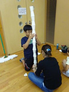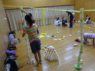 伸びているテープを引くと、タワーが崩れる仕組みです。