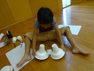 白い紙皿が二重に重なって、蓋をあけるとひよこがでてきます。