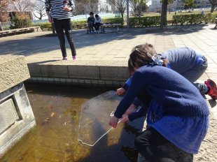 受付のときから、外の池の表面に氷が張っていたのを発見していたので、まずは氷とりに出かけます。