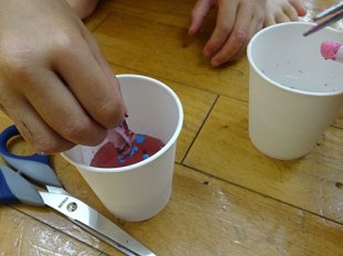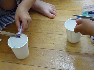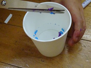 紙コップに水をため、その中にクレヨンを刻み入れるこどもたち。