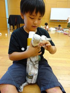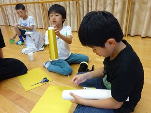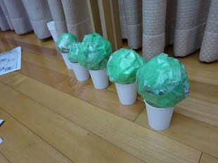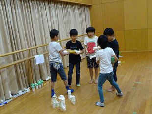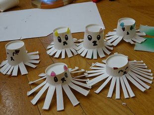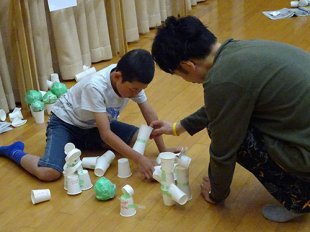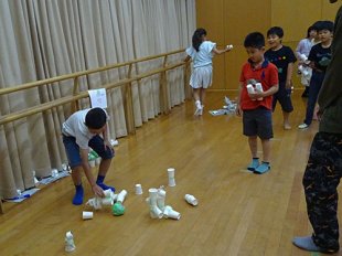 色水づくり、ボーリング、ランチャーづくりに紙コップタワー、貯金箱づくり。