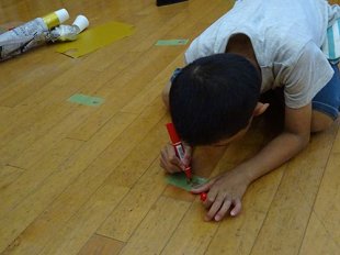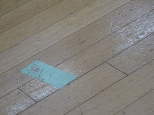 おつぎはなにやら床面にテープを張って、数字を書き始めます。