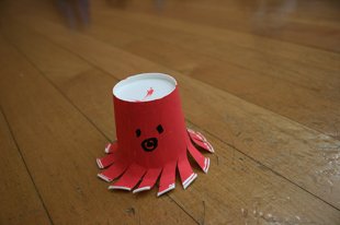 コップの縁を指で押すと、足の弾力でジャンプし、前に進みます。
