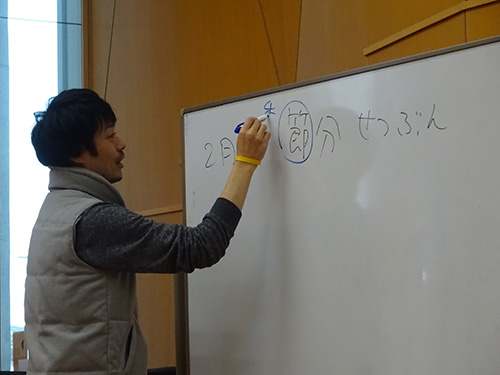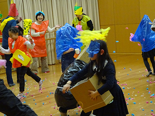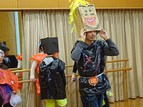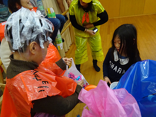 豆、そしてTJの力作、鬼の面ができたところで、いよいよ豆まきへ!