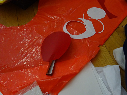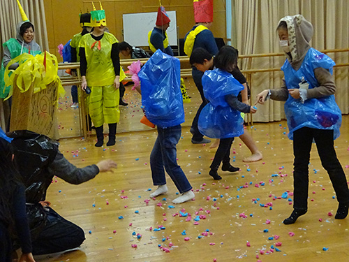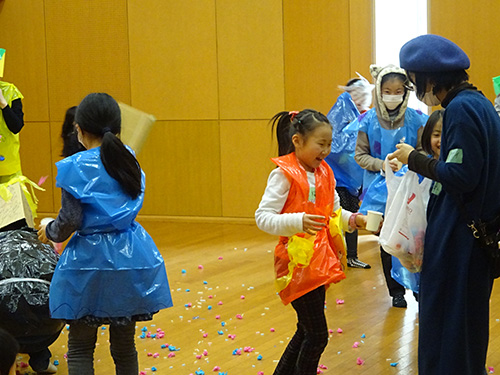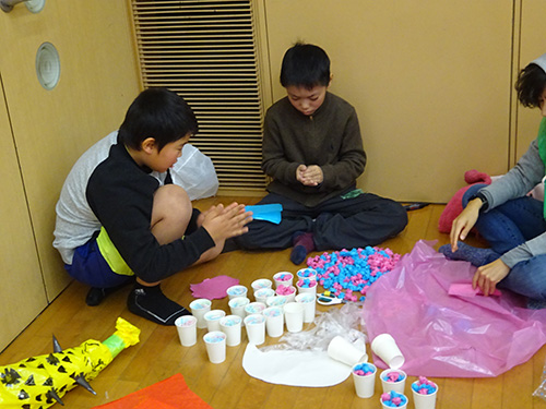お花紙を丸めて、鬼をやっつけるためにいっぱいつくります。