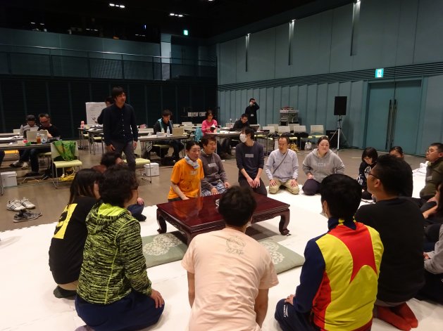 まずは、仮で組んでいる舞台セットの座卓を囲み、全員でスパイゲームを開始!