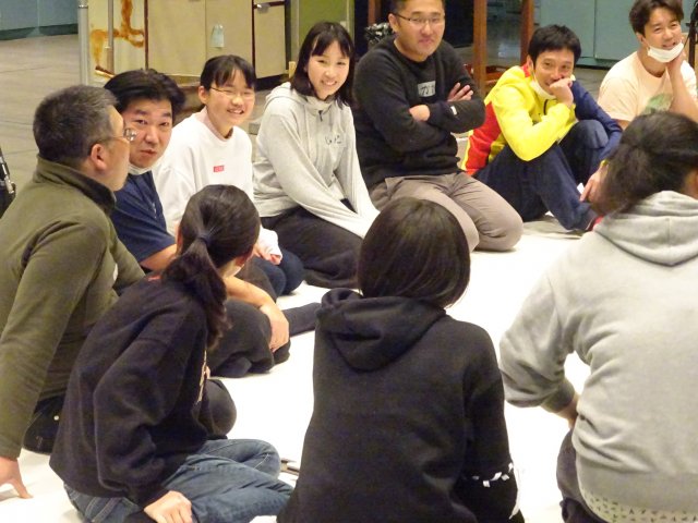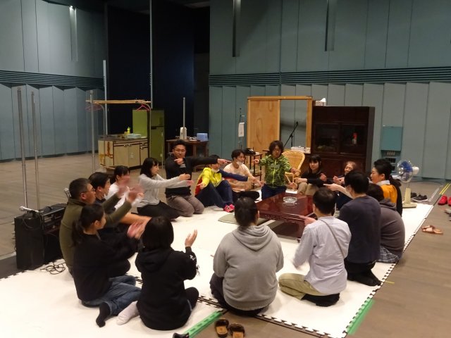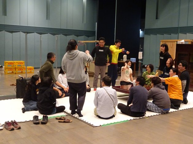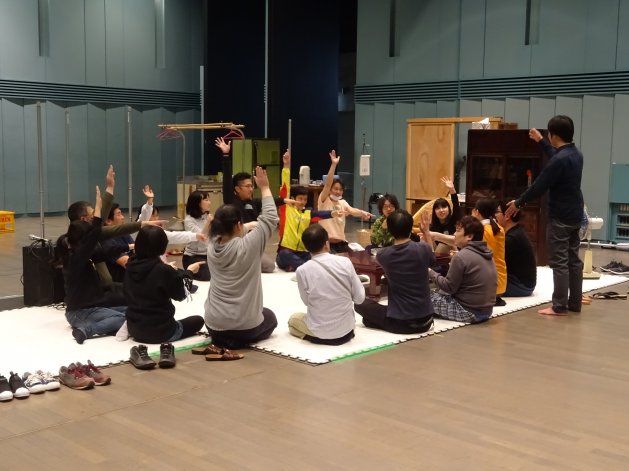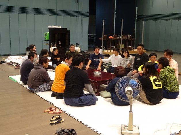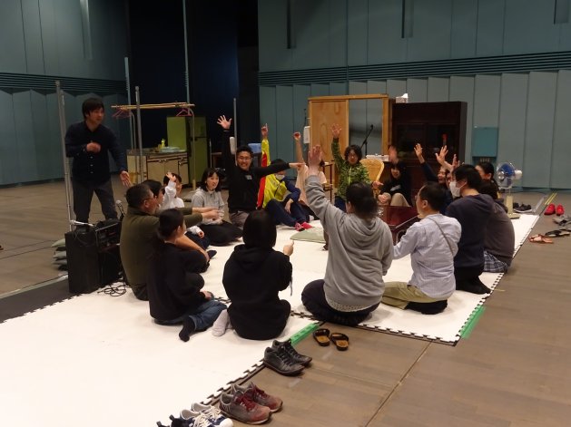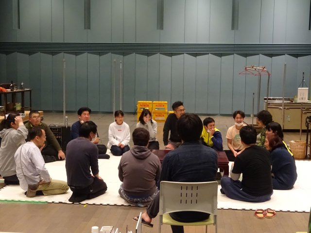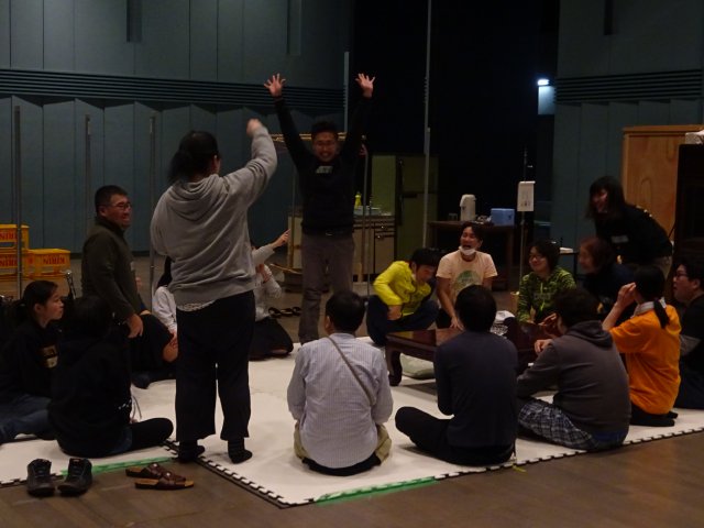 この日は『Mother-river Welcome-華麗なる結婚―』の稽古日で、出演者11名やスタッフとともに、地元の子どもたちから遠くは福岡まで幅広い地域と世代の8名の方が参加し、賑やかな稽古場見学となりました。