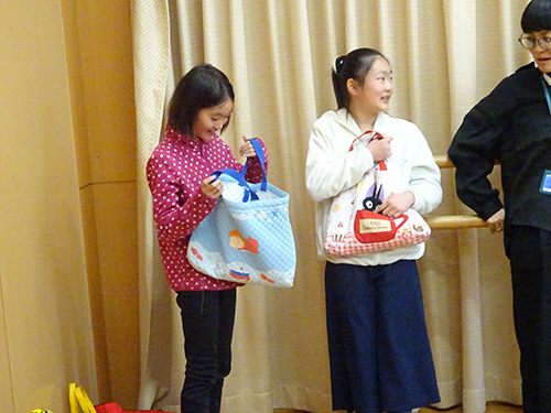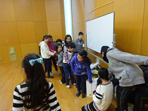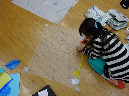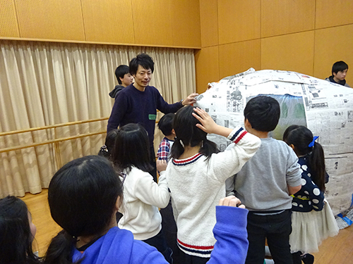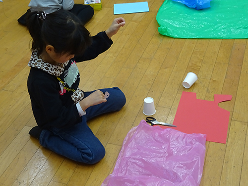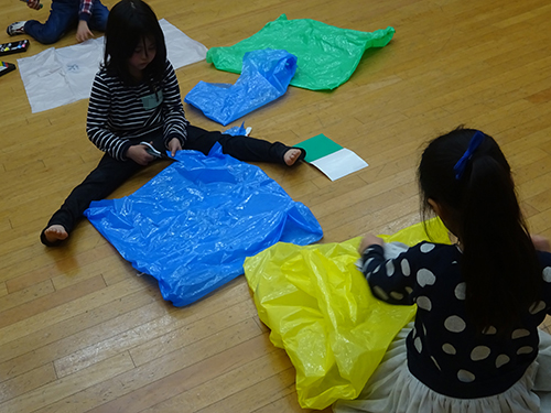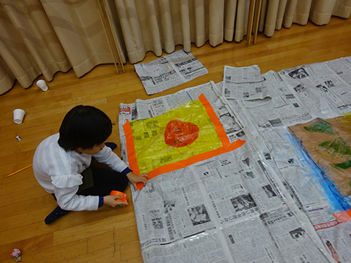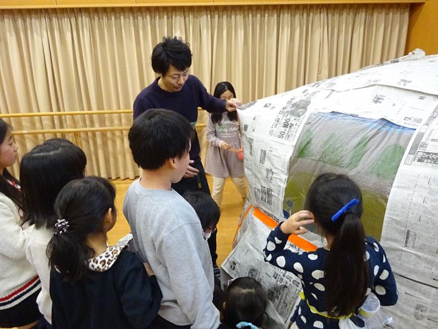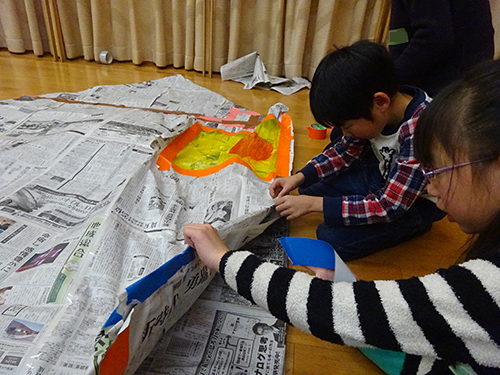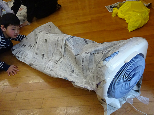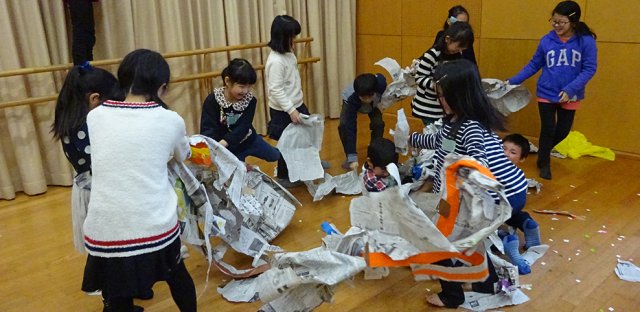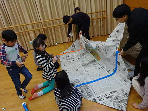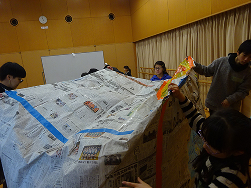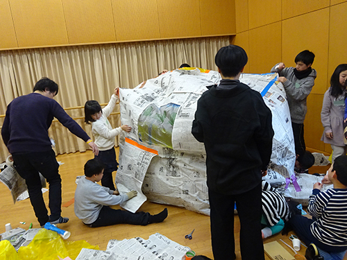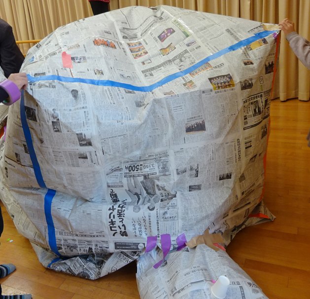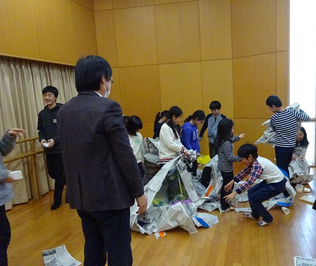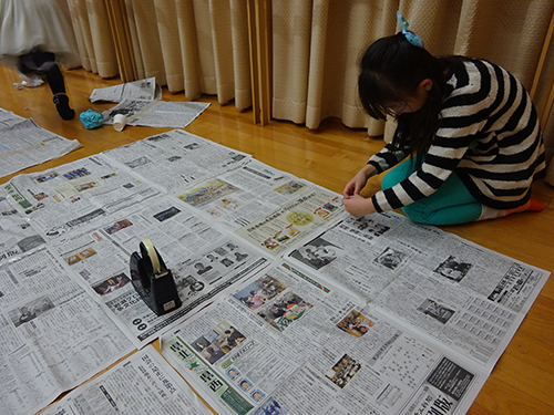 こちらはなにやら中学生のお兄さんたちも交え、新聞紙同士をテープでくっつける作業。
