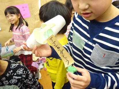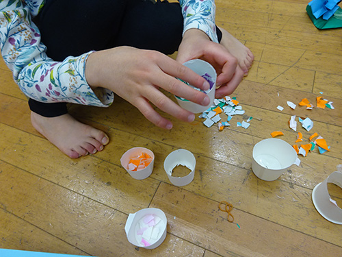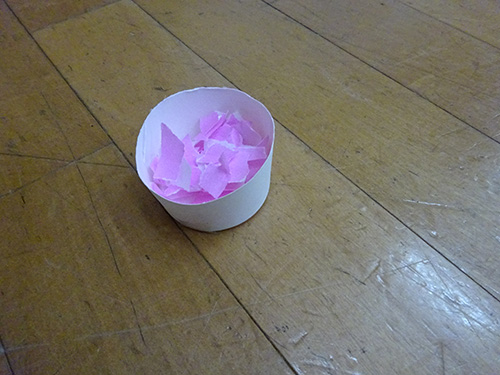 紙コップの底部分に紙吹雪を溜め、底に貼り付けた輪ゴムを引っ張って離すと、その反動で紙が吹き飛ぶ仕組み。