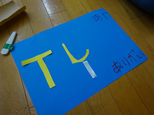 部屋の中にこっそりセッティングしたまっしろなボードに、TJへお礼のメッセージを書き込む!
